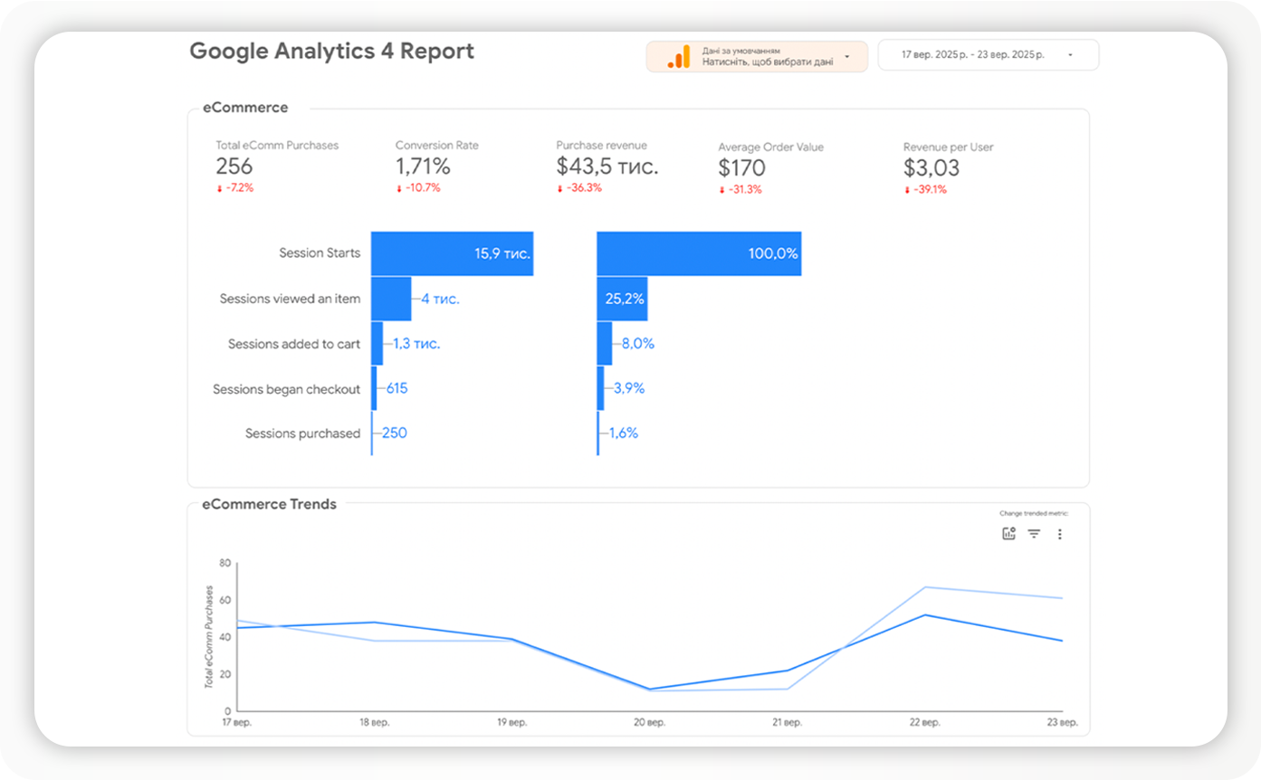 Необходимые источники данных: Google Analytics 4, CRM-системы для более подробной информации о заказах, платформы интернет-магазинов через API или экспорт данных.