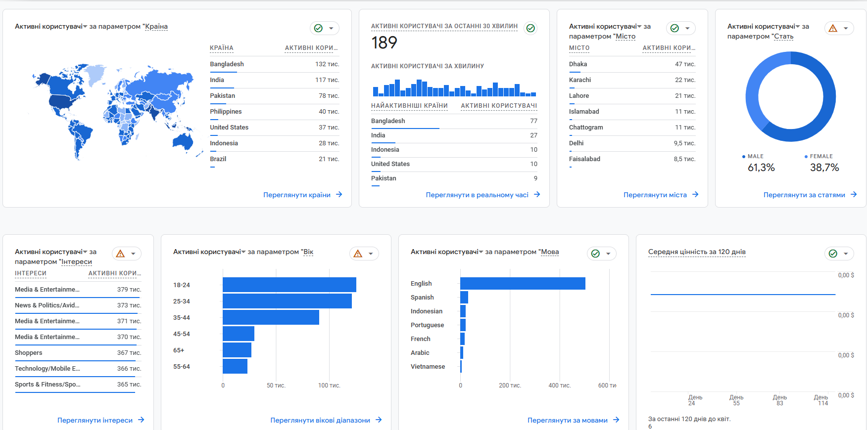 В разделе Пользователь > Демографические показатели можно узнать возраст, пол, местонахождение и язык пользователей.