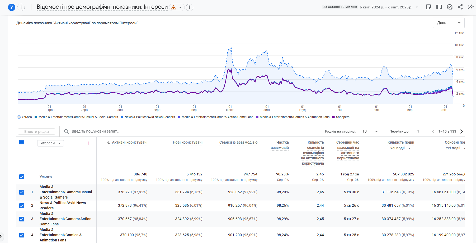 Также вы можете анализировать интересы аудитории (например, технологии, путешествия, фитнес и т.д.), что помогает настраивать персонализированные рекламные кампании.