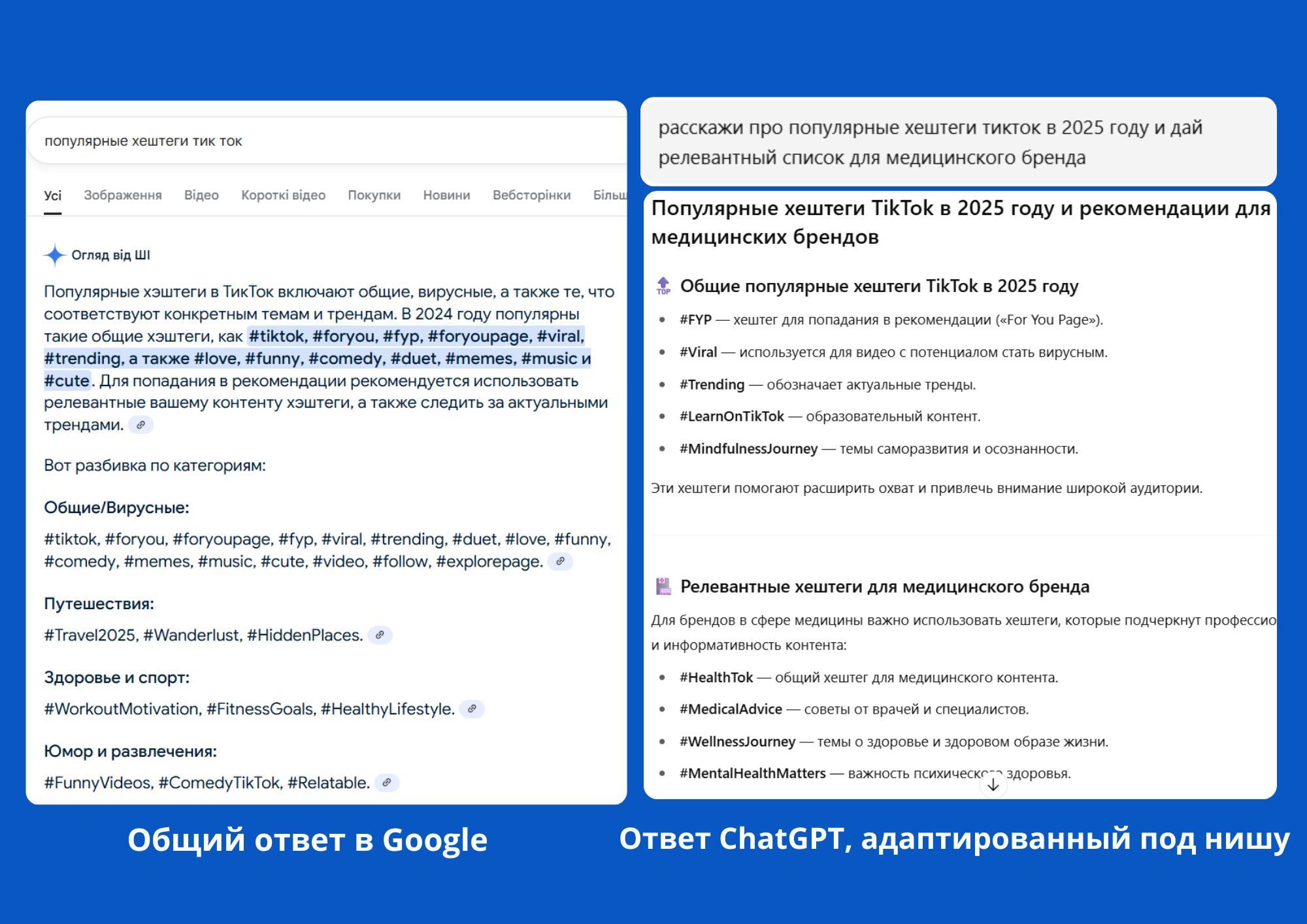 Сравним два ответа от ChatGPT в зависимости от сформированных промптов.
