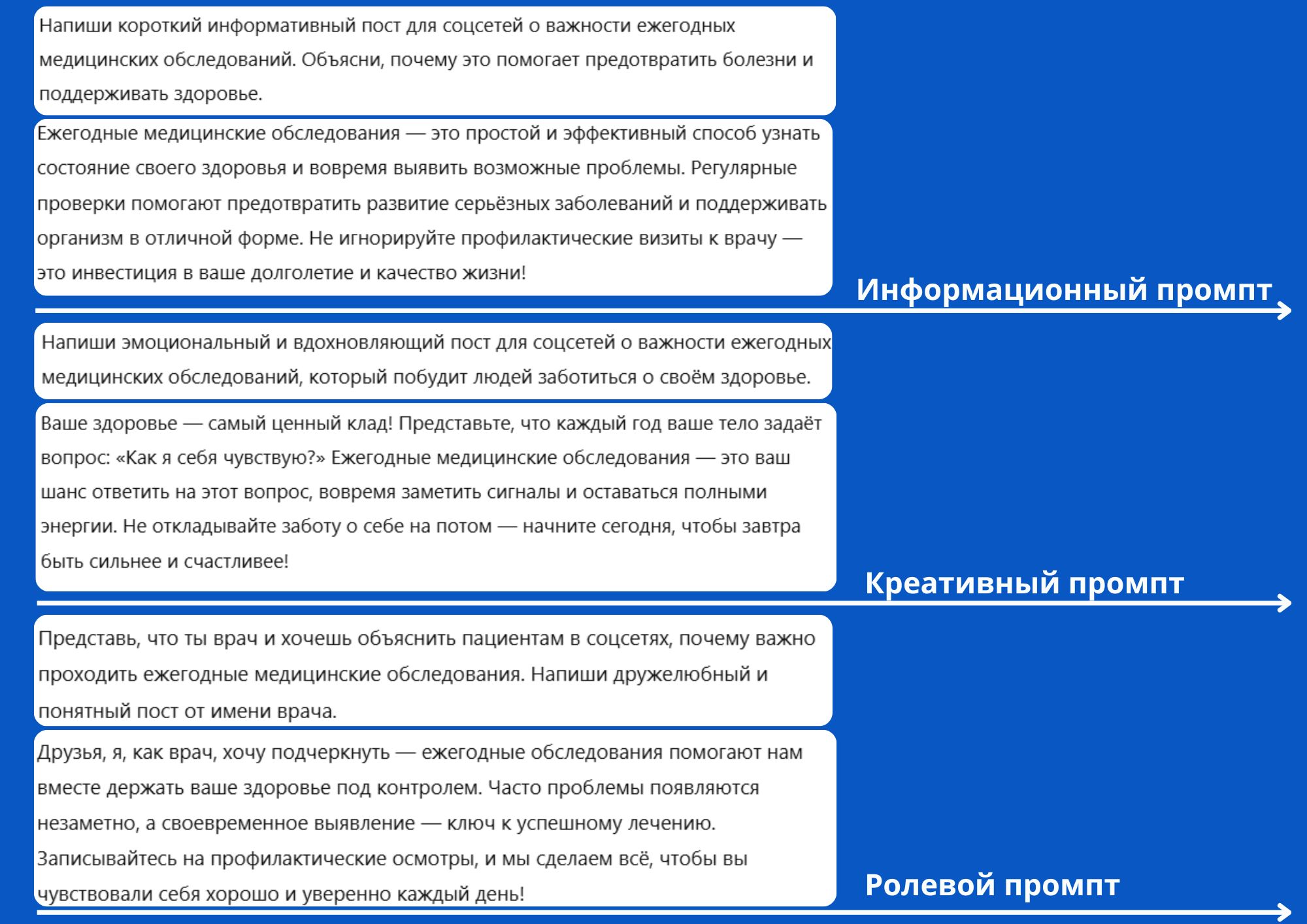 3. Тестируйте разные форматы промптов. Один и тот же запрос можно подать по-разному — и результат будет принципиально другим. Попробуйте варианты в виде инструкции, вопроса, с указанием роли. Это помогает гибко мыслить и понимать, как влияет форма промпта на качество ответа.