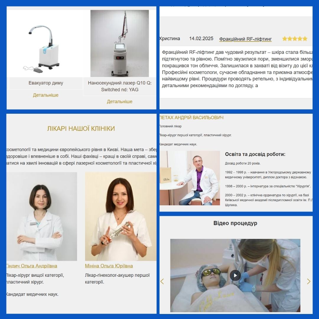 - страницы с профилями врачей, где описан их опыт и указан перечень процедур, которые выполняет тот или иной специалист;