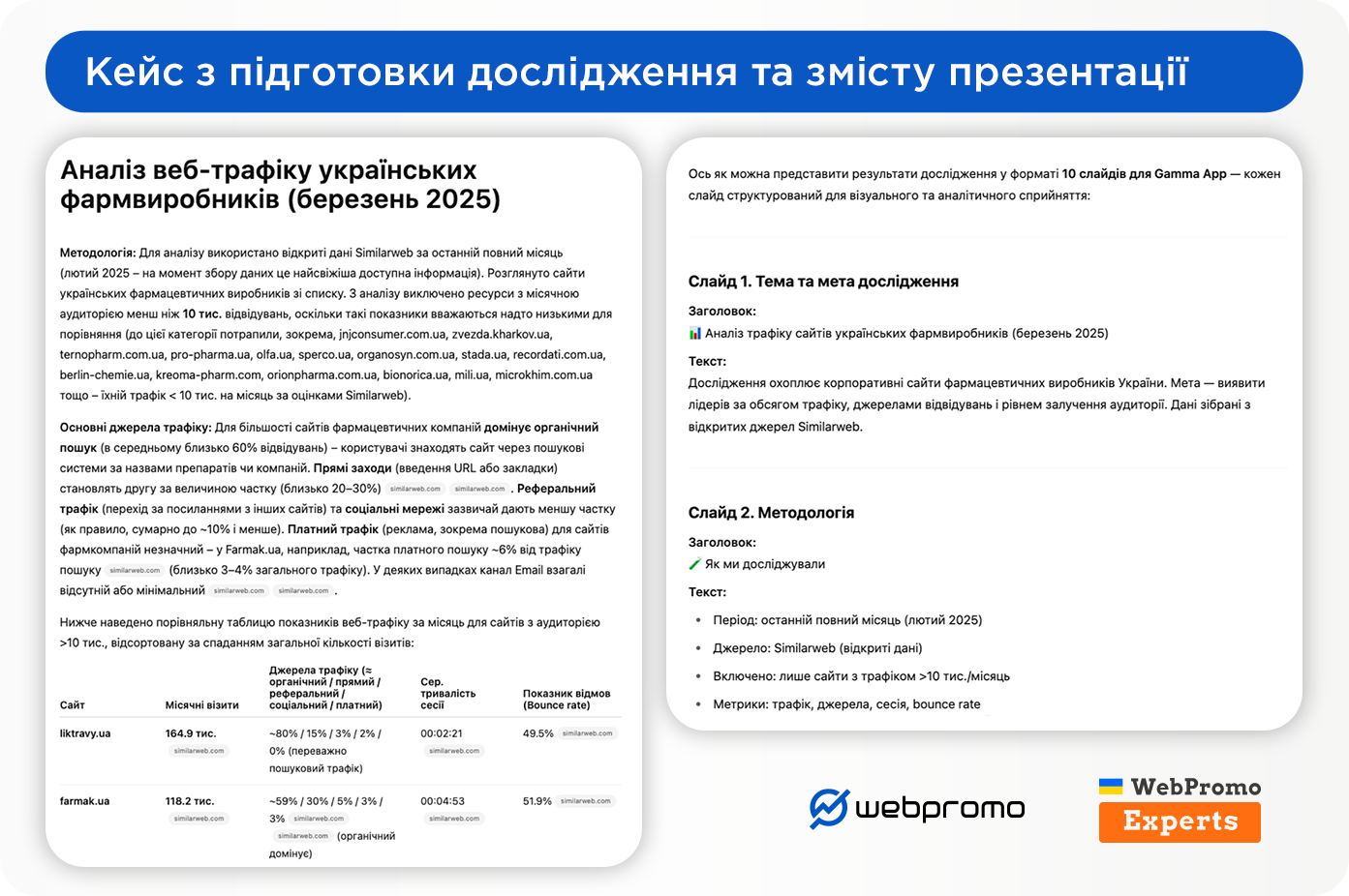 Другий напрямок — аналітика. Один з найпоказовіших прикладів того, як ШІ спростив мою щоденну роботу в цьому напрямку — підготовка глибоких досліджень та презентацій для стратегічних сесій і навчань. Раніше одна презентація займала 3 дні, адже я вручну збирав дані та готував слайди. Сьогодні ця сама задача виконується лише за годину завдяки інтеграції AI-інструментів: GPT проводить попередній аналіз, Deep Research формує логіку, а Gamma оперативно оформлює у готову презентацію.