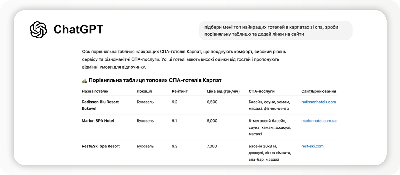 - Інвестуйте в репутацію. GEO — це довгострокова гра. Якщо хочете бути у відповідях GPT — будуйте траст: публікації, згадки, якісний контент, присутність у надійних джерелах.