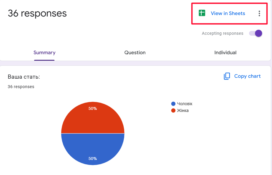 Перейдіть у вкладку «Відповіді». Саме тут ви знайдете все необхідне: від загального зведення, статистики з окремих питань різних користувачів до відповідей конкретного респондента. Усі відповіді збираються у таблиці автоматично. Щоб імпортувати їх, потрібно натиснути на іконку Google Таблиць. Для деактивації функції перетягніть повзунок «Приймати відповіді», якщо отримано необхідну кількість інформації.