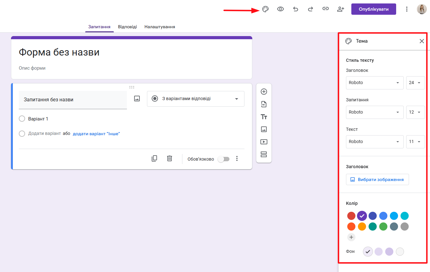 - Додайте питання, вибираючи потрібний тип (текст, множинний вибір, шкала тощо).
