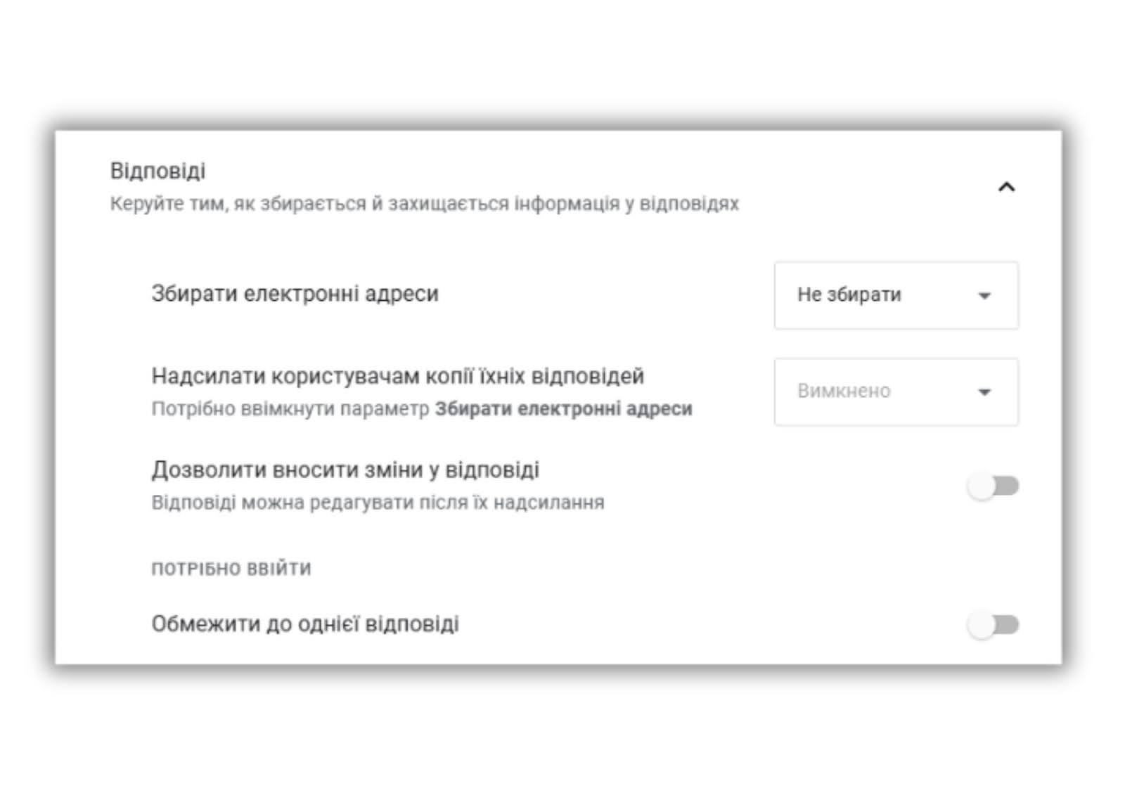 ✔️Загальні налаштування можна використовувати для збирання адрес поштових скриньок респондентів. Виключити опитування однієї і тієї ж людини декілька разів або відкрити доступ без входу в обліковий запис можна за допомогою кнопки «Надсилати не більше одного разу». Актуально у разі проведення досліджень.