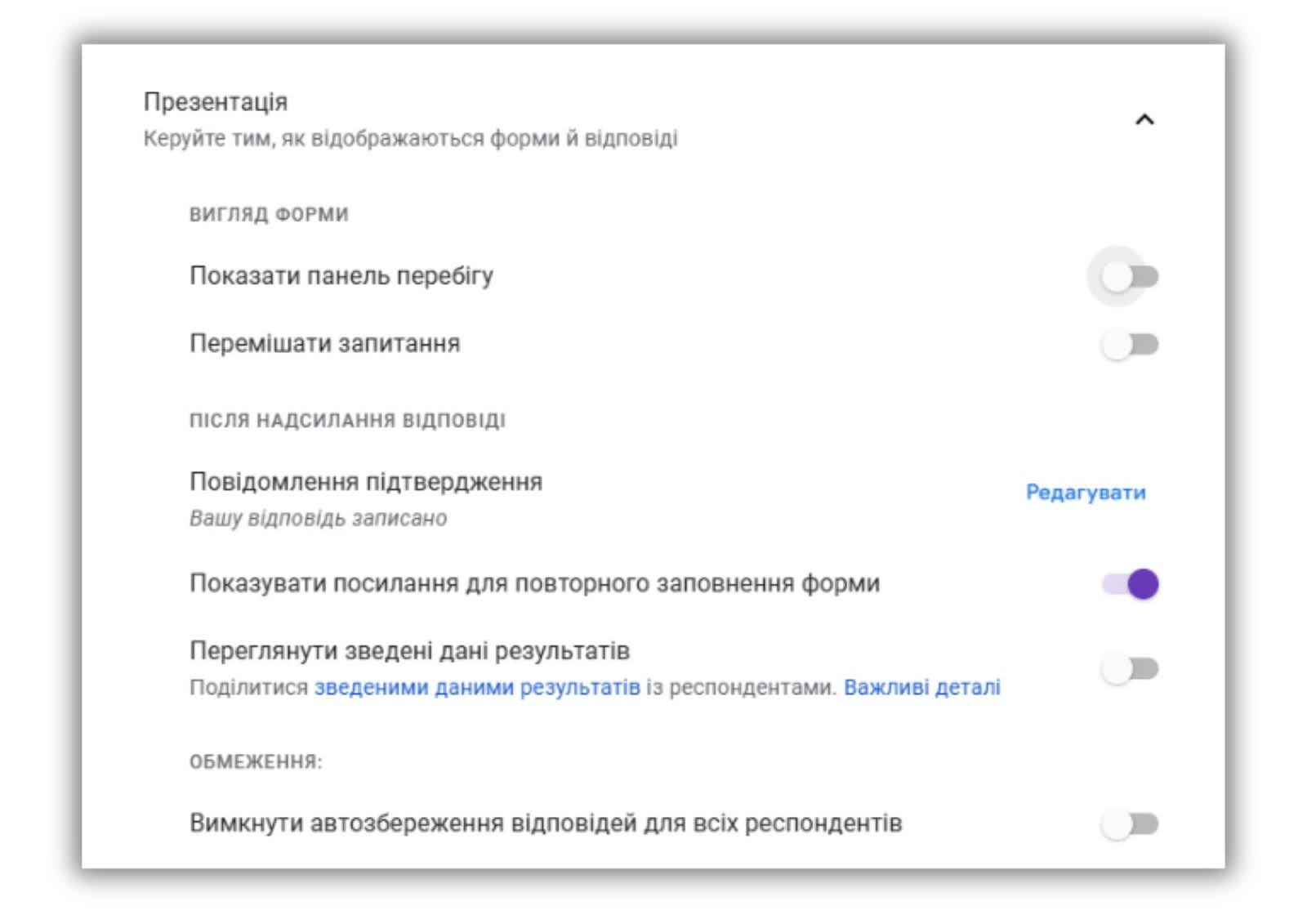 - Обмеження на розмір: максимальна кількість питань в одній формі — 300, а кількість варіантів відповіді для одного питання — 200.