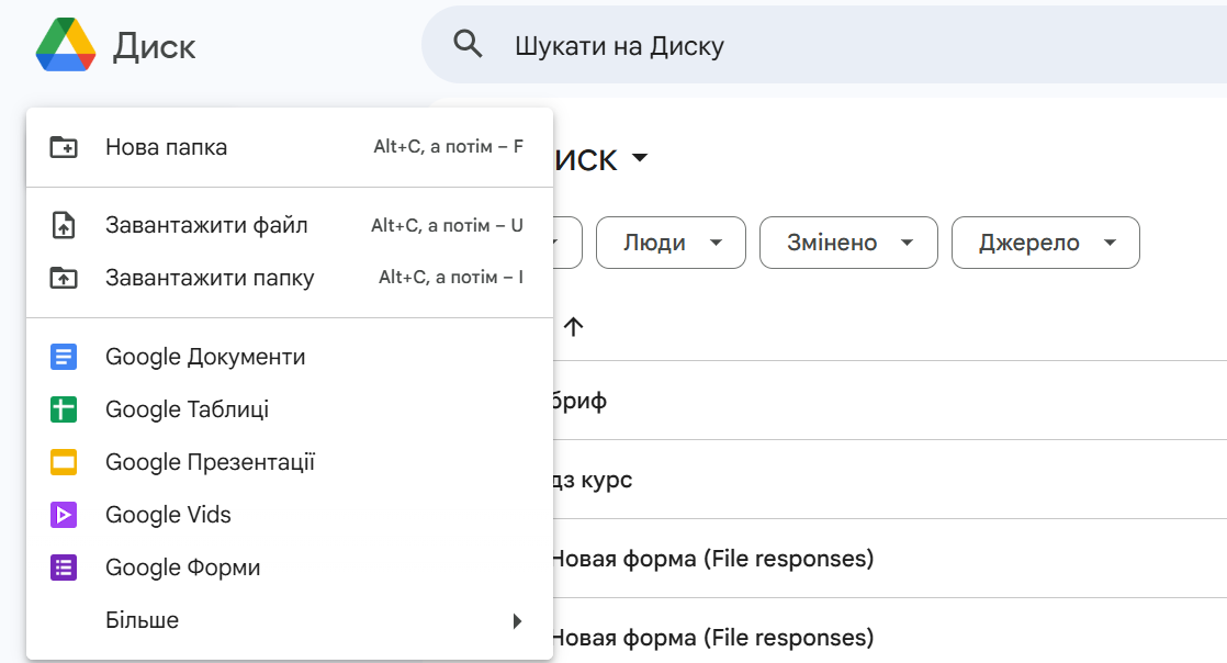 Також можна скористатись Google Диском: увійдіть до свого акаунту та натисніть «Створити». У спадному списку оберіть «Форми».