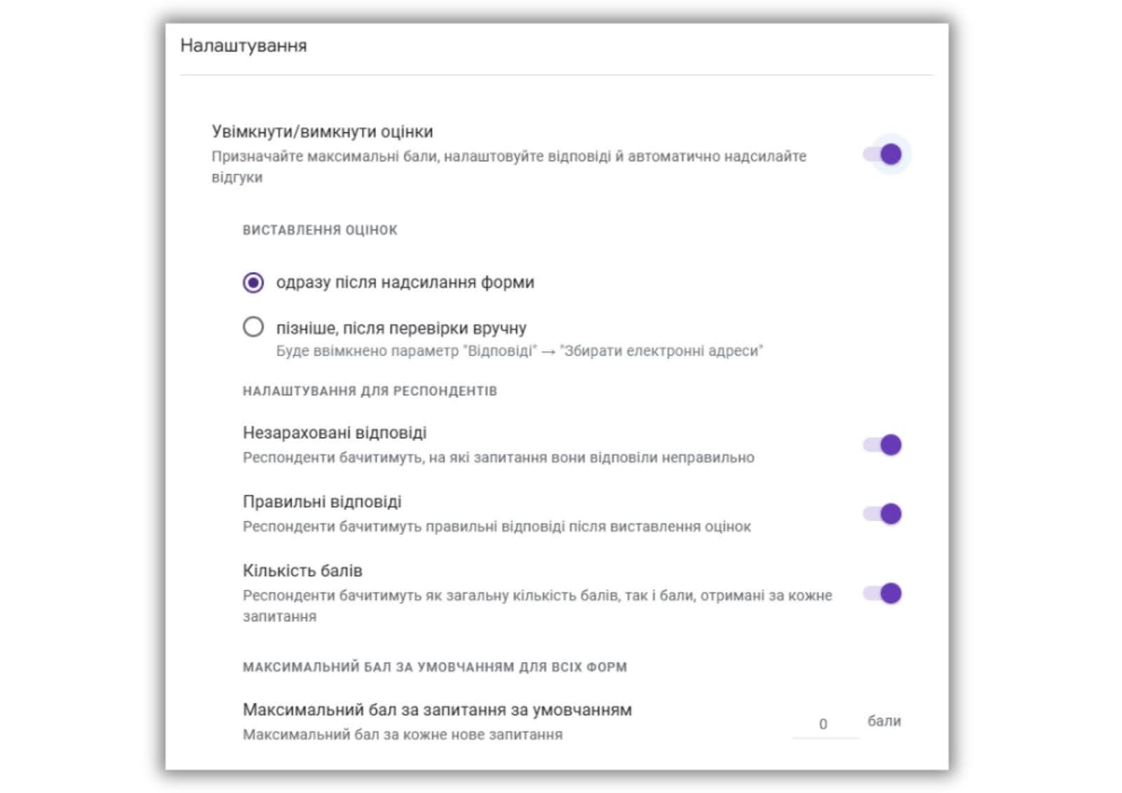 ✔️Тести: закладка активується, коли ви пересунете повзунок «Увімкнути/вимкнути оцінки». Для швидкого фідбеку виберіть пункт «Показати оцінку відразу після надсилання».