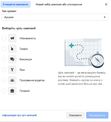 - Визначте мету кампанії — впізнаваність, розгляд, конверсія. Від обраної мети залежать алгоритми, за якими Meta буде показувати ваше оголошення.