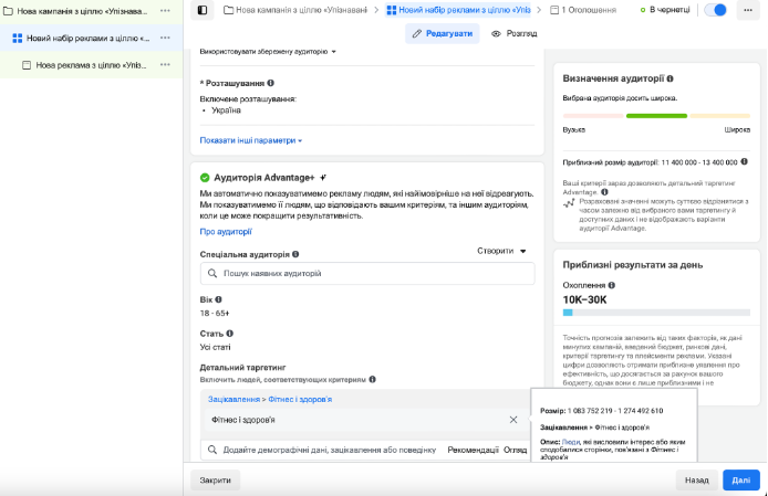 Важливо! Розділ «Назва аудиторії» необхідно заповнити обов’язково, «Місця» за рекомендацією, «Інтереси» можна пропустити. Після налаштування аудиторії система покаже, скільки людей потрапляють під зазначені вимоги. Якщо охоплення буде незначним (зазвичай, менше ніж 2,5 тисячі користувачів) — кампанія може виявитися неефективною, адже рекламу мало хто побачить. Тоді краще змінити параметри пошуку.